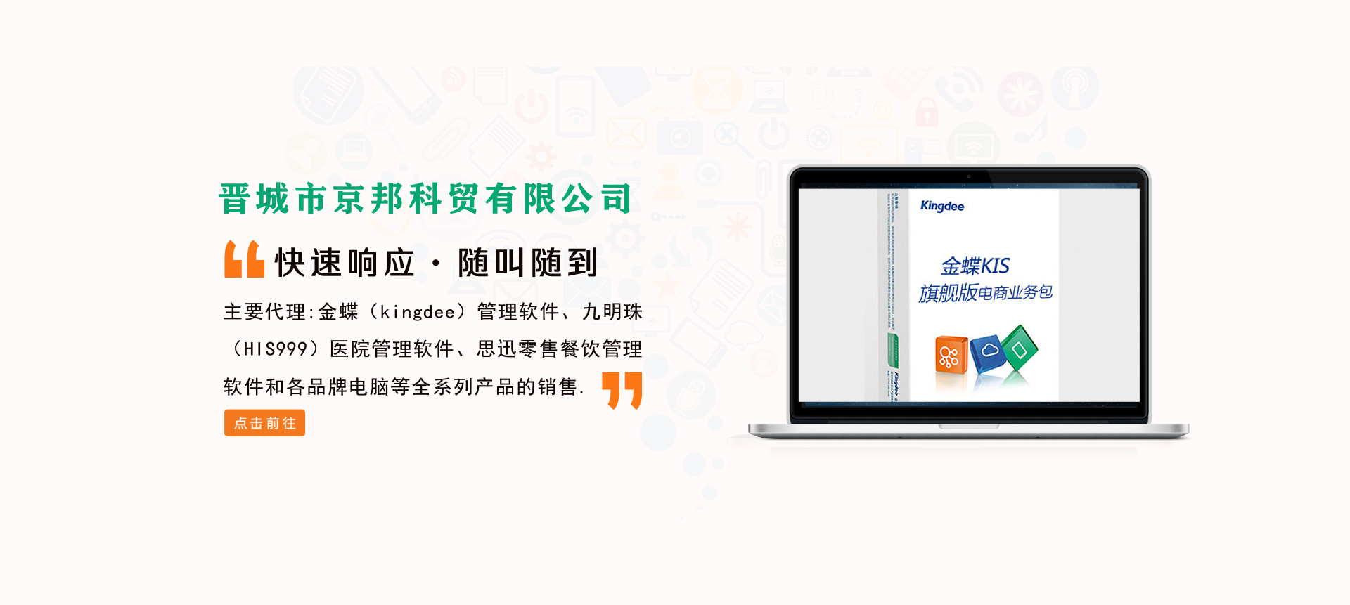 晉城市京邦科貿(mào)有限公司成立于2006年,是經(jīng)晉城市工商行政管理局登記注冊(cè),主要從事軟件銷售、電腦銷售和企業(yè)管理咨詢等相關(guān)業(yè)務(wù),是金蝶軟件(中國)有限公司、深圳九明珠信息科技有限公司、深圳萬國思迅軟件有限公司在晉城地區(qū)高級(jí)代理商,主要代理金蝶(kingdee)管理軟件、九明珠(HIS999)醫(yī)院管理軟件、思迅零售餐飲管理軟件和各品牌電腦等全系列產(chǎn)品的銷售。